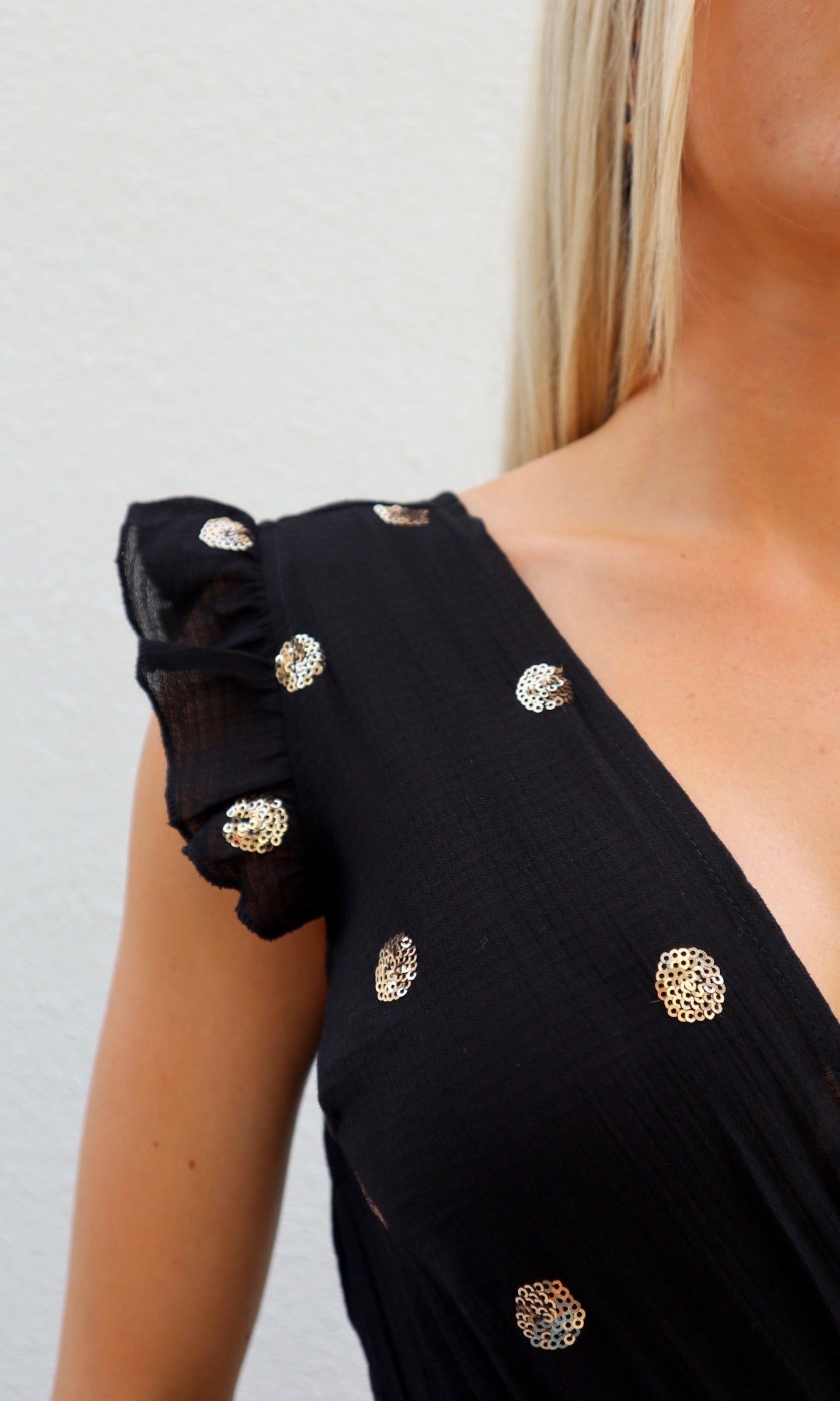 A stunning playsuit with statement gold sequin spots. You will sparkle from across the room.